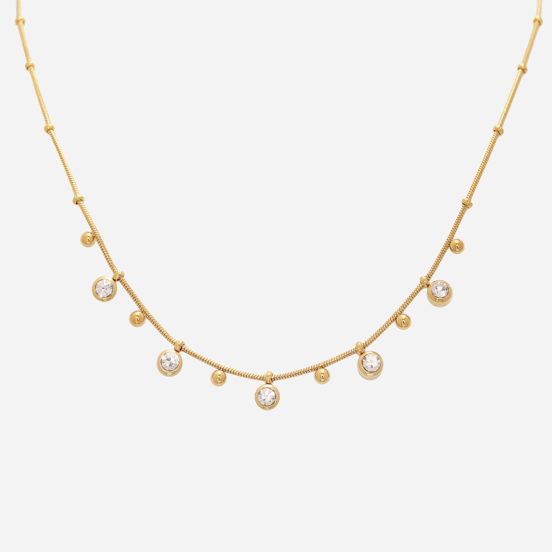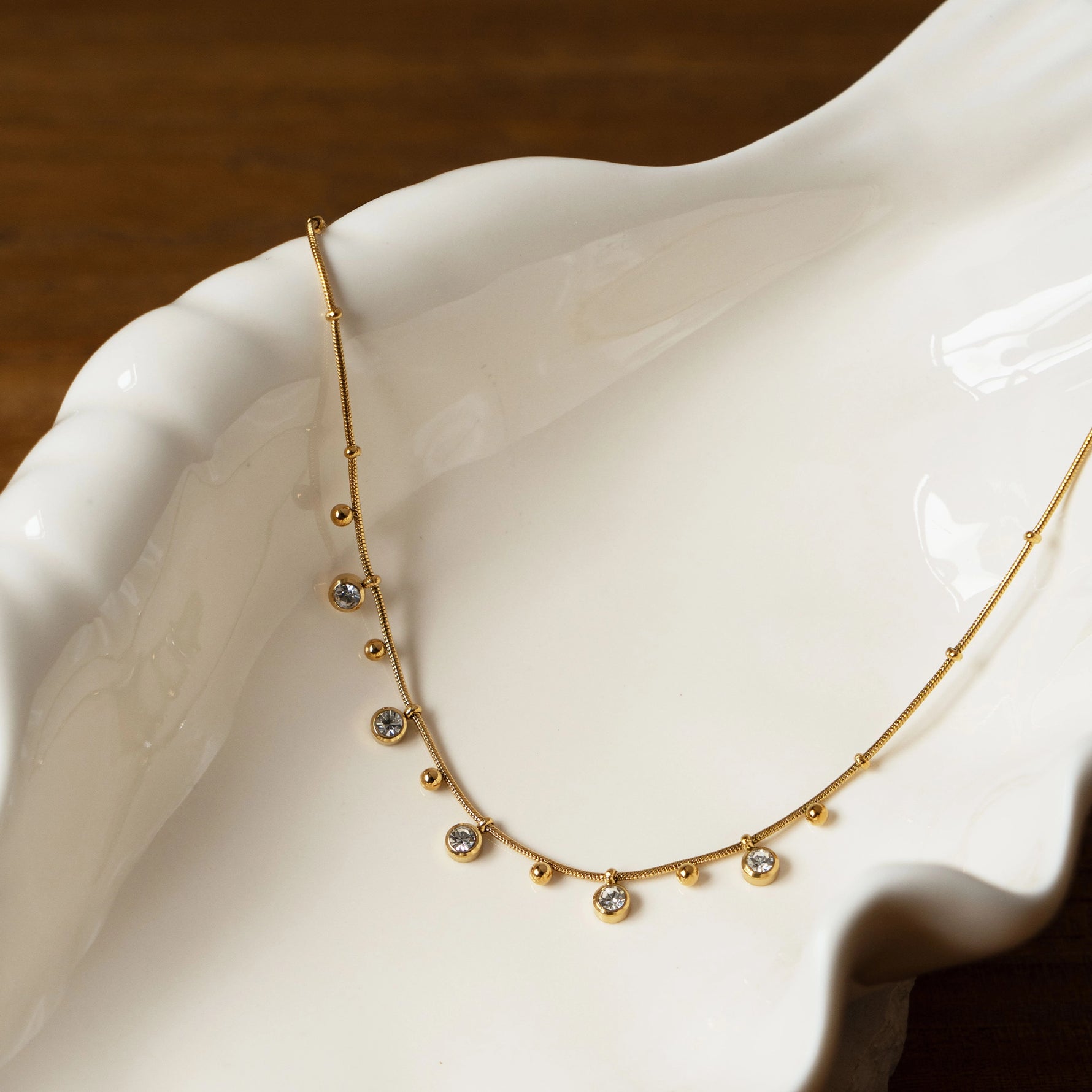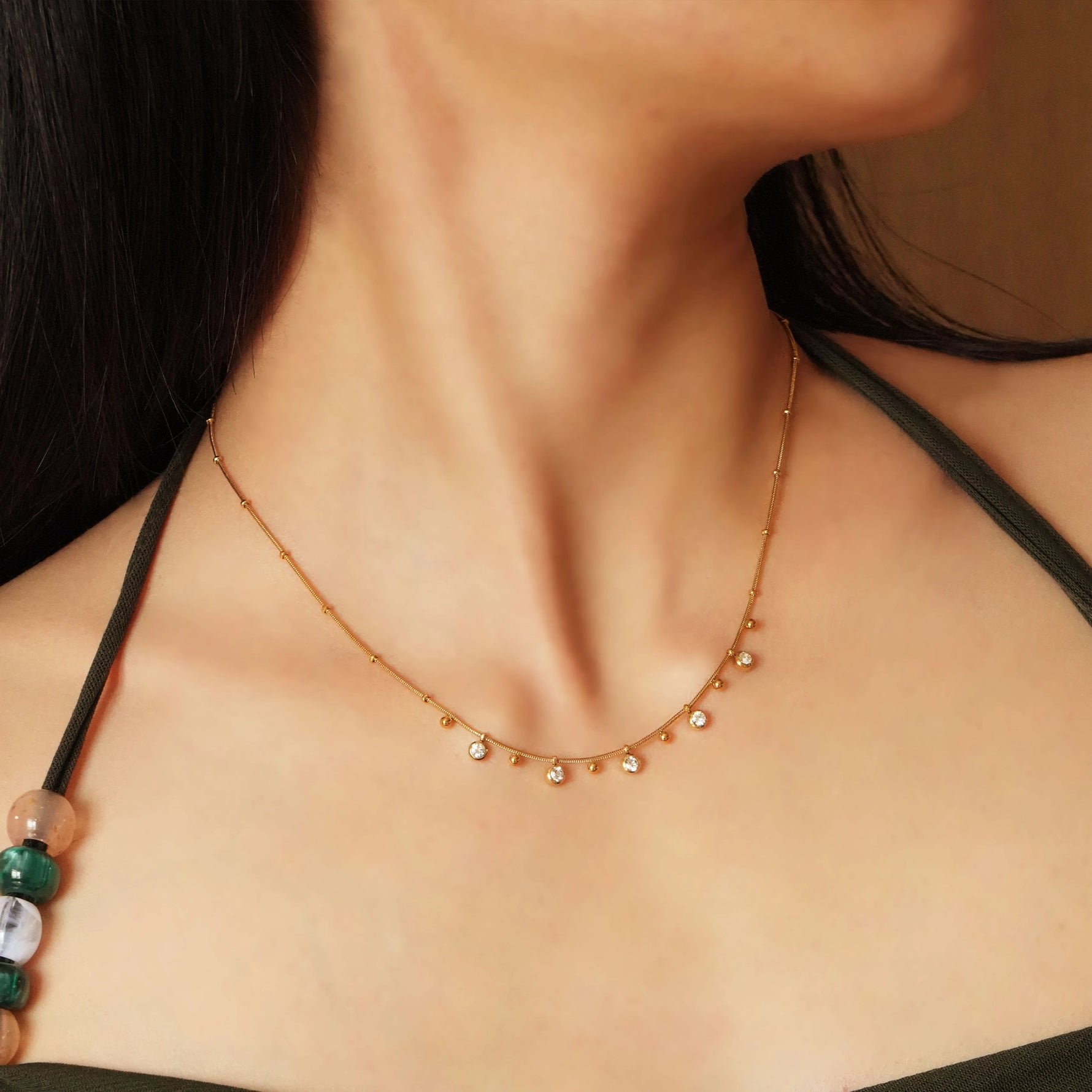 Delicate gold-toned chains drape the collarbone, dotted with five hand-selected crystals staggered like constellations—each facet catching light to create a subtle, captivating glow. Whether paired with a power suit or a weekend sweater, this necklace elevates your presence: commanding attention in boardrooms, sparking conversations at cafes. Let its understated brilliance be your silent confidence booster, a reminder that your light shines brightest when you own every role you play.