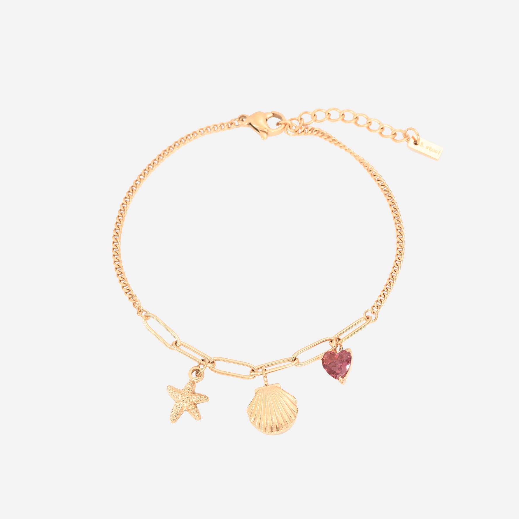 Inspired by beach vacations' carefree charm, the bracelet blends starfish, shells, and a red heart. Golden chains mirror sunset glows, crafting a seaside - elegant vibe. Each charm whispers of sandy shores, wave rhythms, and holiday joy, letting you carry vacation relaxation into daily life.With ocean - inspired charms and golden glow, it brings coastal bliss and romantic whimsy. Wear it to feel summer’s lightness, sparking joy like a beachside sunset—perfect for adding holiday magic to any moment.