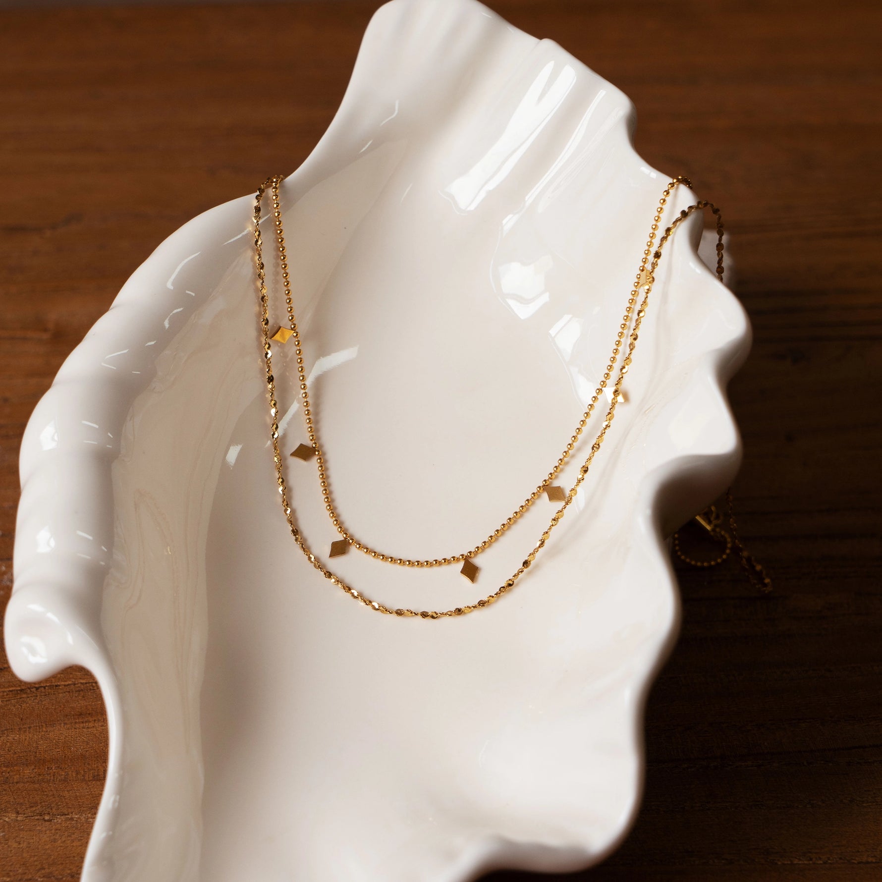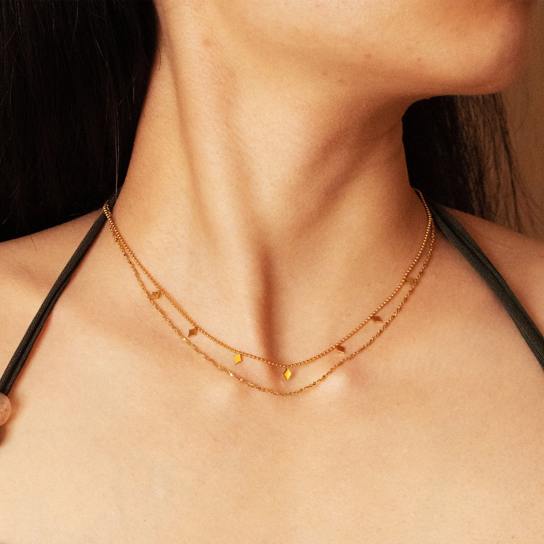 Two delicate gold chains are artfully layered, adorned with small diamond - shaped metal pendants that resemble mysterious totems, exuding a unique exotic charm. Whether paired with a minimalist work outfit to showcase individualistic style or combined with casual wear to highlight laid - back charisma, it effortlessly elevates the overall aesthetic. Shine with confidence in any crowd—each appearance is a perfect demonstration of distinctive allure, adding a touch of mysterious and captivating color to your multifaceted life.