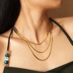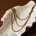 Three snake - bone chains interweave in layers, curling around the neck like a golden stream. The delicate chain pattern catches light, casting a subtle yet captivating sheen. It demands no attention yet commands it—paired with a simple white shirt, it speaks to professional sophistication; matched with evening wear, it releases allure for grand occasions. Each wear is a silent ode to elegance: no need to shout, just to exist in refined grace.